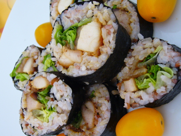 p.s. 後來那卷有點鬆,因為料不夠了啦~wombat 一直偷拿雞肉吃,氣死我了!